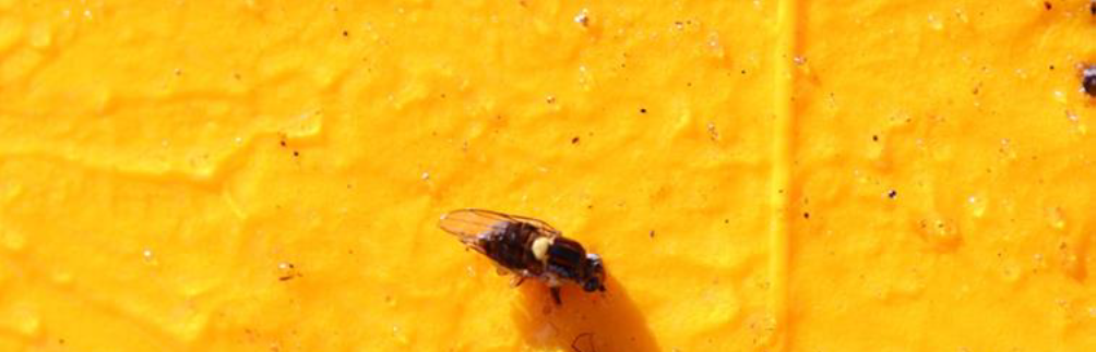 Bygflue, der er fanget på en limplade. LandboNords limplade har endnu ikke fanget bygfluer.