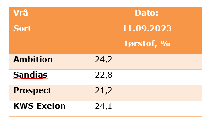 Som gennemsnit ligger de på godt 23% tørstof med en variation fra 21,2 til 24,2% i Vrå. Målet for tørstof ligger på 31-32%. Får vi et normalt efterår, så kommer vi hen i den første uge af oktober, før høsten er i gang.