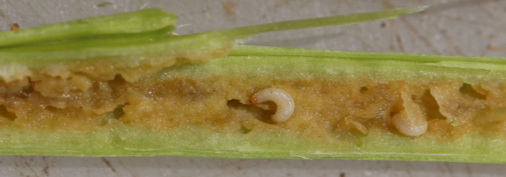 Se billedet herunder, hvordan bladribbesnudebillernes larver ser ud. Deres gnav medfører at marven er mørk. Det er ikke sikkert, at angreb koster udbytte, medmindre stænglen knækker.