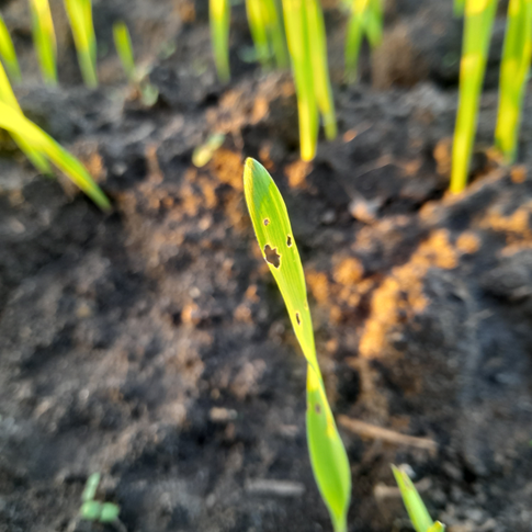 Vinterbyg sået 16.september er nu i st. 10. Snegle har gnavet i bladet, men ikke dræbt planten. I vådt vejr er der stor risiko for, at snegle æder det senest såede vintersæd. Så er det vigtigt at bekæmpe snegle før skaden er sket.