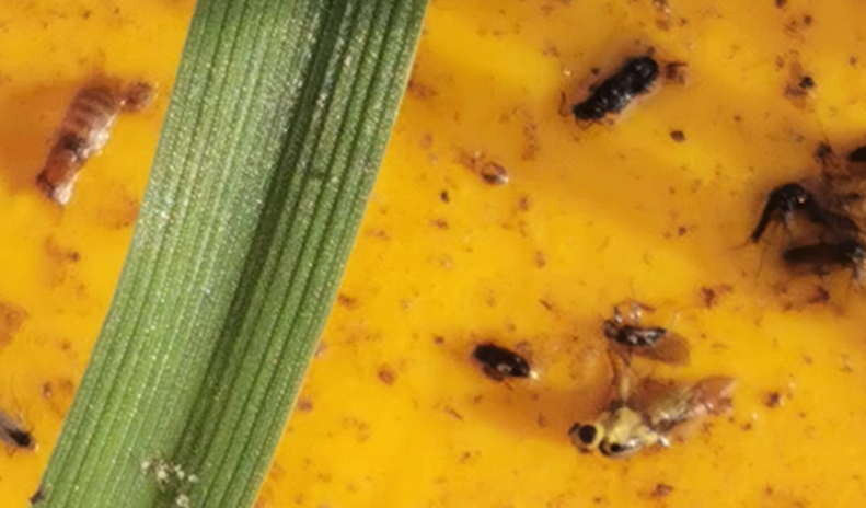 Limplade fra hvedemark i Rønnebjerg, Vrå. Der er fanget 2 bygfluer sammen med talrige andre arter. Hveden er nu for langt fremme til at bekæmpelse er aktuel i denne mark. Vi fortsætter optællingen i 3 uger mere. Fotograferet den 27/9/2023 Sofie H. Olesen, LandboNord.