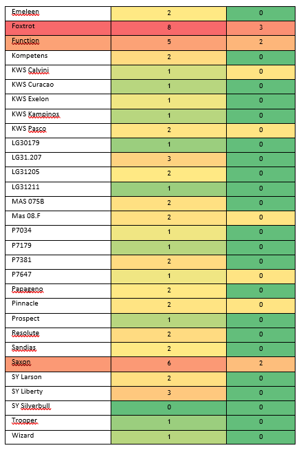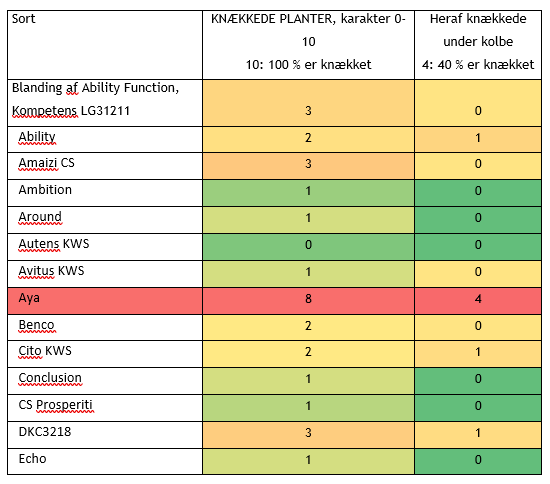 Tabel med karakter for knækkede planter blandt majssorter i 2023 i Vrå