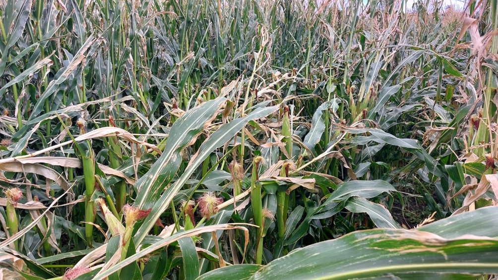 Billede. Nogle majssorter knækkede mere end andre efter stormen den 14. – 15. august. De mest ramte sorter kommer ikke kun fra en af forædlerne. Foto 15. august 2023 af Jens Lyhne Kristiansen. Se tabel med karakter for nedknækning.