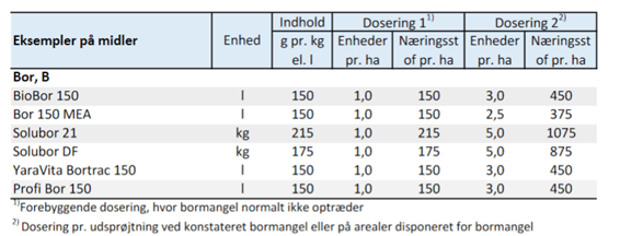 Ønsker man at forebygge bormangel udbringes 1 – 2 liter bor-produkt.