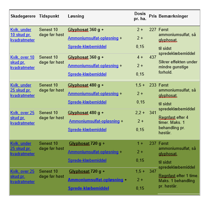 Tabel: Kvikbekæmpelse i foderkorn før høst.