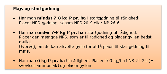 Når man kun har plads til fra 0 til 7 kg P i startgødning pr. ha, så skal man undersøge, om gyllen kan placeres til majsene i stedet, og så placere 75-100 kg/ha svovlsur ammoniak, i form af en NS21-24. Det forbedrer muligheden for en god start og godt udbytte. Gyllen skal gerne ud så tæt på majssåning som muligt, dog skal jorden have lov at sætte sig efter placering, for at kunne lave et ordentligt såbed. Gyllen bør altid tilsættes nitrifikationshæmmer ved placering.