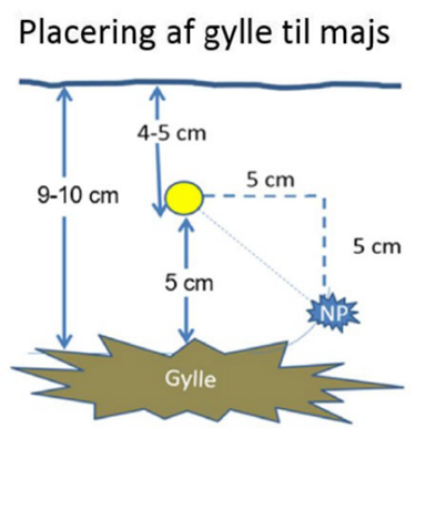 Ved placering af gylle skal man være opmærksom på, at gyllen placeres i et bånd under frøene, så der er 10 cm fra jordoveroverfladen til overkant gylle, og 5 cm mellem frø og overkant gylle. En evt. NP-gødning placeres 5 cm under og 5 cm ved siden af frøet. Se figur straks herefter.