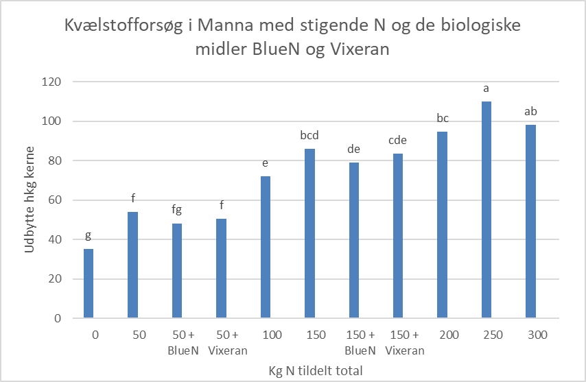 Bogstaverne over søjlerne indikerer resultaternes signifikansgruppe. Har søjlerne samme bogstav er de ikke signifikant forskellige fra hinanden. Vi får ikke et betydeligt merudbytte eller tab ved at tilføre BlueN eller Vixeran, når vi ser på 50 kg N +/- BlueN eller Vixeran og 150 kg N +/- BlueN eller Vixeran. Ved stigende kvælstoftildeling i handelsgødning er der signifikant merudbytte i op til 250 kg N pr. ha.