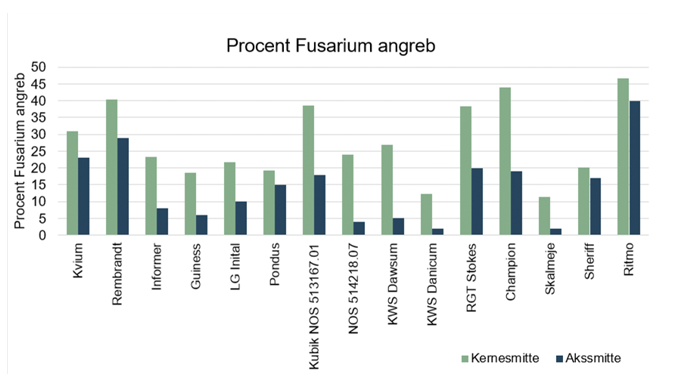 Der findes ingen sorter, som har fuldstændig resistens overfor fusarium, men der findes sorter med moderat til god resistens. Som det fremgår, er der en del forskel i modtageligheden blandt de dyrkede sorter i Danmark.