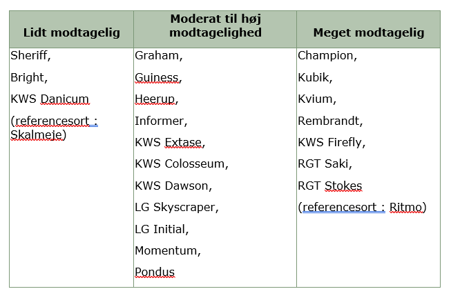 I tabel 1 er sorterne delt ind i 3 modtagelighedsklasser på baggrund af resultater fra i år og tidligere år.