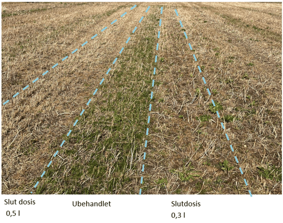 Ved en slutdosis på 0,3 liter pr. ha er lidt mere ukrudt men stadig meget god effekt.