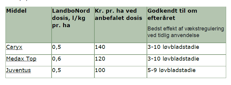 Tabel 2. Oversigt over godkendte midler med effekt på vækst til brug om efteråret i vinterraps. Det anbefales så vidt muligt kun at anvende midler, som ikke tæller med i triazolregnskabet, dvs. Caryx (vækstregulering) og Juventus (vækstregulering og svampe).