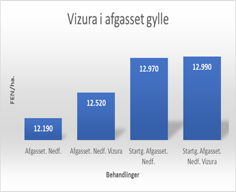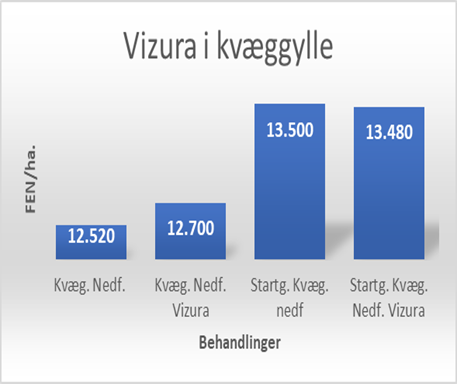 I forsøg blev der med 2 liter Vizura/ha i gennemsnit målt tendens til merudbytte på ca. 340 FEN/ha. I det ene forsøg på en grovsandet jord (JB 1) blev der opnået signifikant merudbytte helt op til 1500 FEN/ha.