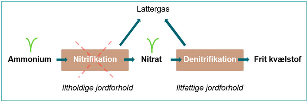 Figur 1. Simpelt kvælstofkredsløb i jorden der illustrerer, hvor nitrifikationen hæmmes. SEGES