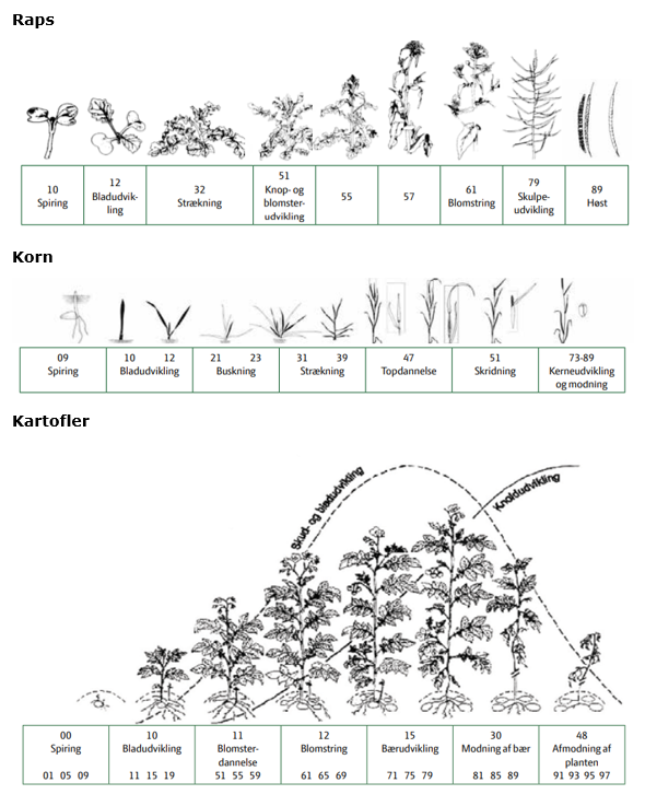 Der skal i sprøjtejournalen også påføres vækststadie ved behandling. Herunder ses udviklingsstadie for de mest gængse afgrøder.