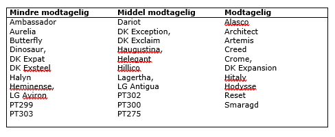Tabel. Oversigt over rapssorters modtagelighed for lys bladplet.