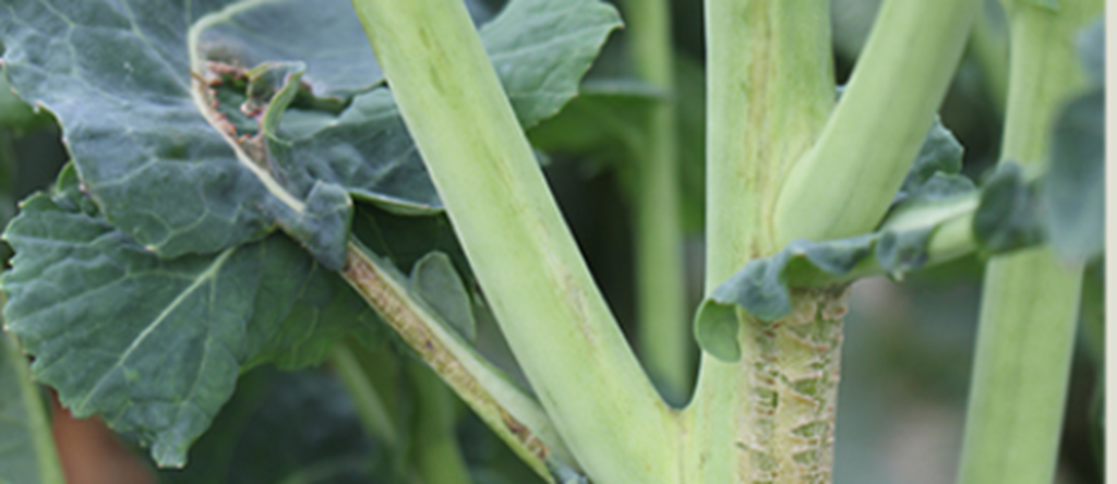 Billede. Lys bladplet på bladstilk og stængel. Ligner hudafskrabning. Bemærk, det forkrøblede blad, som lys bladplet har fremkaldt. Foto Landbrugsinfo.dk 17/4/2023.