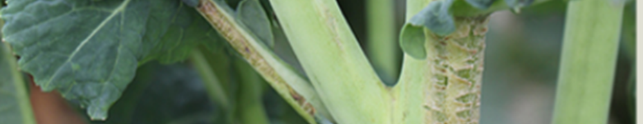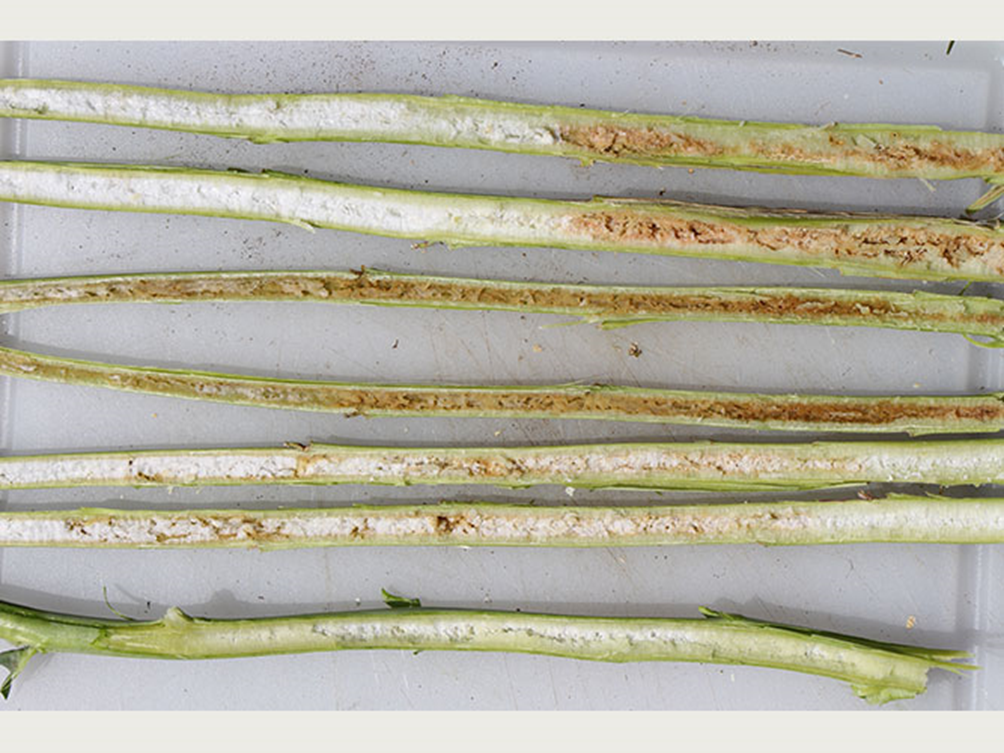 Billede. Først i juni kan skaden af bladribbesnudebiller ses ved at flække stænglen. De mørke områder vurderes. Kun den ene af de 4 stængler på billedet har angreb af betydning. Foto fra Landbrugsinfo.dk.